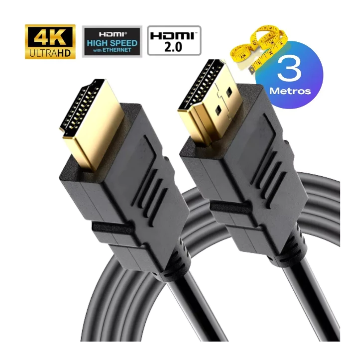 Cabo HDMI 5 metros de Alta Qualidade e Super Resistente Imagem limpa, nítida sem interferências, nem perda de qualidade Descrição: O cabo HDMI versão 1.4 é indicado para a conexão com aparelhos com entrada HDMI como TVs, videogames, computadores e monitores. O uso do cabo garante uma ótima conectividade e consequentemente uma transmissão de dados sem perda de sinal. O cabo possui revestimento emborrachado, conectores inoxidáveis e banhados a ouro evitando ruídos e interferências. A estrutura é bem resistente, o que garante uma longa vida útil.