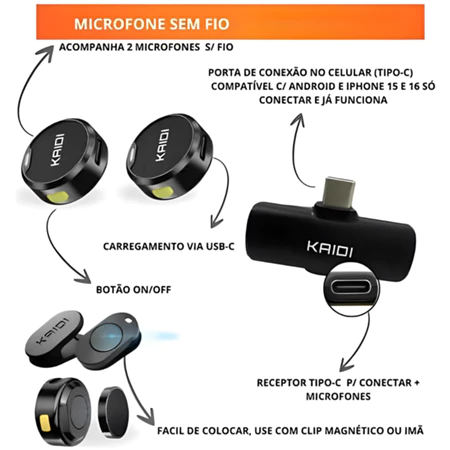 O Microfone Lapela Sem Fio Duplo Kaidi é ideal para quem busca qualidade profissional em áudio com máxima praticidade. Com design compacto e microfones redondos com imã, ele oferece fixação segura e facilidade de uso para gravações, entrevistas, aulas, podcasts e vlogs.